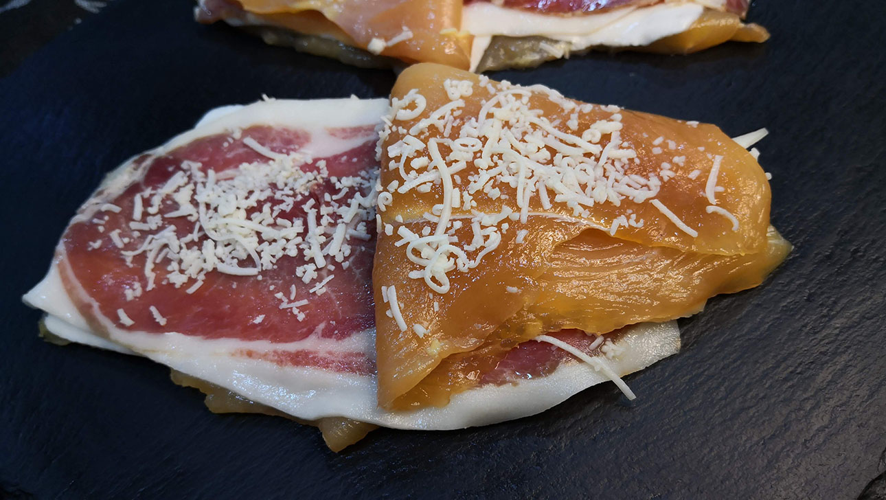 Filete de nuestro lomo casero adobado, relleno de rulo de cabra, cebolla caramelizada y bacon Cachopos Filete de nuestro lomo casero adobado, relleno de rulo de cabra, cebolla caramelizada y bacon
